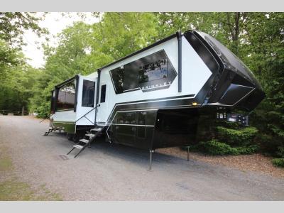 Sleeps 4 Slides 3 Length 45 ft 11 in Ext Width 8 ft 5 in Ext Height 13 ft 4 in Hitch Weight 3450 lbs GVWR 22500 lbs Dry Weight 18600 lbs Fresh Water Capacity 150 gals Grey Water Capacity 156 gals Black Water Capacity 85 gals Tire Size 215/75 R17.5H Furnace BTU 35000 btu Fuel Capacity 60 gals Number Of Bunks 1 Available Beds King Refrigerator Type GE Energy Star with Ice Maker and Filtered Water Refrigerator Size 19 cu ft Convection Cooking Yes Cooktop Burners 4 Shower Size 30" x 42" Number of Awnings 3 Axle Weight 7000 lbs Garage Size 12 ft 6 in LP Tank Capacity 30 lbs Water Heater Type Tankless TV Info LR 50" Smart TV & Televator, Garage 43" Smart TV, BR 32" Smart TV Awning Info Power w/Neon Lights Axle Count 3 Washer/Dryer Available Yes Number of LP Tanks 2 Shower Type Standard Electrical Service 50 amp Similar Toy Hauler Fifth Wheel Floorplans