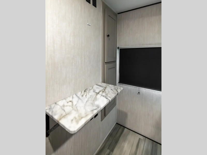 The modern interiors feature Casino Bisque cabinetry and Shaker cabinet door frames, seamless edge countertops and Congoleum residential flooring which are all complimented by the functional use of each space. Each model also includes a full bath and a functional kitchen making your camping adventures comfortable and easy. Outside, you'll find a power tongue jack, Solid Steps, a hot and cold exterior shower, plus many more conveniences. There are also super lube axles for easy towing, and a 200 watt solar panel with a 30 amp control charger for off-grid capabilities!