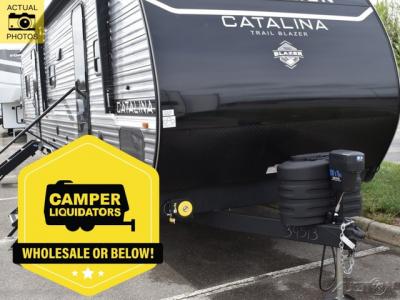 The best looking, most affordable toy hauler is found in the Catalina Trailer Blazer by Coachmen. Each one is constructed with a seamless alpha roof membrane, an enclosed and fully sealed underbelly, and a cambered structural steel I-beam frame for added support. There is a rear loading cargo door with a 3,000 lb. capacity, a black out screen wall with a zip walk-thru and windows, plus 500 lb. tie-downs to secure your toys. You'll love the interior with its Congoleum woodplank linoleum flooring and LED interior lighting. Head outside to find an electric awning with multicolored LED lights and a remote, a 15' Toy Loc cable, a "Leash Link" quick hookup D-ring for pets, and upgraded aluminum wheels. The Catalina Trail Blazer also comes with a JBL Aura Cube media center, plus premium JBL interior speakers for your pleasure!