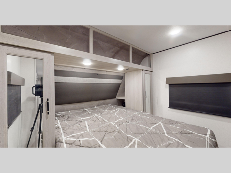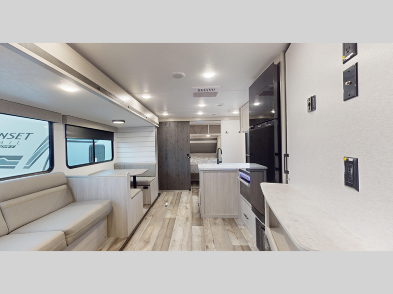 Each model features an enclosed and heated underbelly for added protection plus a one-piece seamless super flex roof for added strength. There are also magnetic slam latch doors outside, along with solar power prep, backup camera prep, and a power awning with LED lights. Inside, you'll enjoy the hardwood cabinet doors, solid surface kitchen countertops, a decorative bedspread and many more comforts.