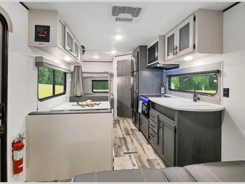 Sleeps 5 Length 21 ft 7 in Ext Width 8 ft Ext Height 9 ft 9 in Int Height 6 ft 4 in Hitch Weight 399 lbs Dry Weight 3037 lbs Cargo Capacity 953 lbs Fresh Water Capacity 21 gals Grey Water Capacity 28 gals Black Water Capacity 28 gals Furnace BTU 20000 btu Number Of Bunks 2 Available Beds Queen Refrigerator Type 12V Refrigerator Size 3.3 cu ft Cooktop Burners 2 Number of Awnings 1 AC BTU 8000 btu Awning Info 8' Power Axle Count 1 Shower Type Standard Similar Floorplans