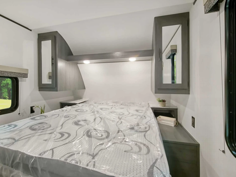 - Overhead storage w/ cabinet doors above bed