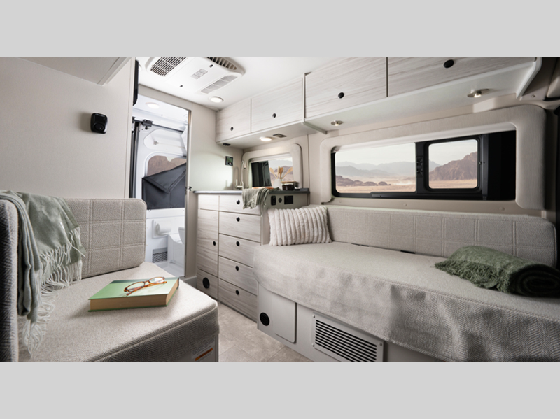 Sleeps 2 Length 17 ft 10 in Ext Width 6 ft 11 in Ext Height 9 ft 3 in Int Height 6 ft 2 in Interior Color Harvest Exterior Color Silver Hitch Weight 3500 lbs GVWR 8550 lbs Fresh Water Capacity 21 gals Grey Water Capacity 24 gals Black Water Capacity 4.75 gals Tire Size LT225/75R16E Furnace BTU 13500 btu Generator 2,800W Gas Fuel Type Gas Engine 3.6L V6 24V VVT Chassis RAM ProMaster 1500 Cargo Van Horsepower 276 hp Fuel Capacity 24 gals Wheelbase 136 in Torque 250 ft-lb Refrigerator Type Refrigerator/Freezer Refrigerator Size 3 cu ft Cooktop Burners 1 Shower Size 25" x 43" Number of Awnings 1 Axle Weight Front 4629 lbs Axle Weight Rear 5291 lbs Water Heater Type Aqua Hot GEN 1 Hydronic AC BTU 13500 btu Awning Info 10' Thule with LED Light Strip Gross Combined Weight 12000 lbs Shower Type Wet/Bath Shower Electrical Service 30 amp Similar Floorplans
