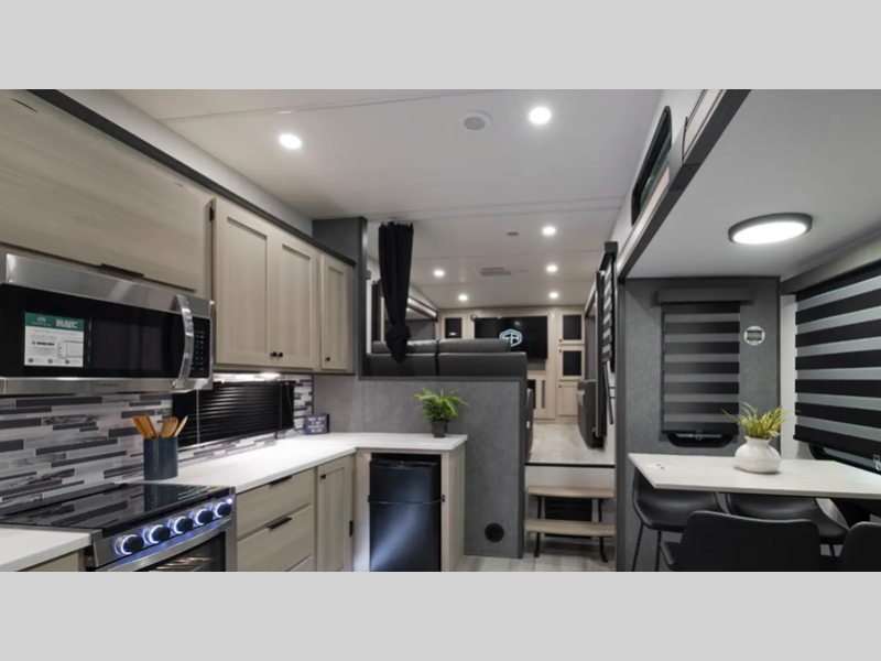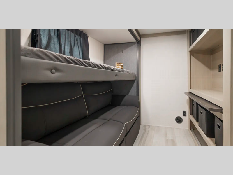 Sleeps 5 Slides 4 Length 43 ft 3 in Ext Width 8 ft Ext Height 13 ft 6 in Hitch Weight 2150 lbs GVWR 14908 lbs Dry Weight 12208 lbs Cargo Capacity 2700 lbs Fresh Water Capacity 60 gals Grey Water Capacity 114 gals Black Water Capacity 76 gals Furnace BTU 35000 btu Number Of Bunks 3 Available Beds King Refrigerator Type 12V Refrigerator Size 16 cu ft Number of Awnings 1 LP Tank Capacity 20 lbs Water Heater Type On Demand Tankless AC BTU 18000 btu TV Info LR LED TV Awning Info 19' Power Axle Count 2 Washer/Dryer Available Yes Number of LP Tanks 2 Shower Type Standard Electrical Service 50 amp Similar Floorplans