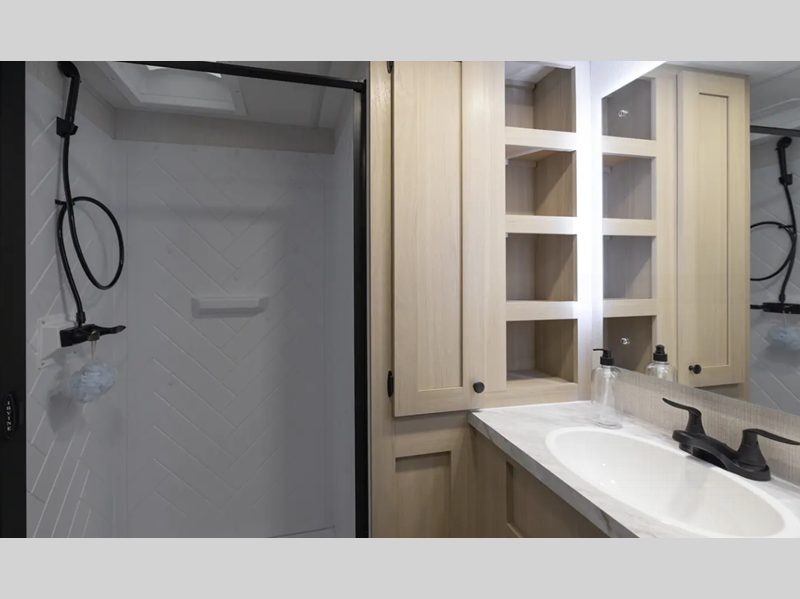 Each model is constructed with a vacuum bonded, welded aluminum structure, along with a PVC roof membrane, residential fiberglass insulation, and many durable construction materials. You will love the oversized opening windows in the living room, the walk-in shower in the bath, and the residential backsplash in the kitchen. The Climate Package helps extend your camping season and the Expedition Package includes many hassle-free amenities such as an outdoor shower, heavy duty slam latch baggage doors, and 4-point auto leveling!