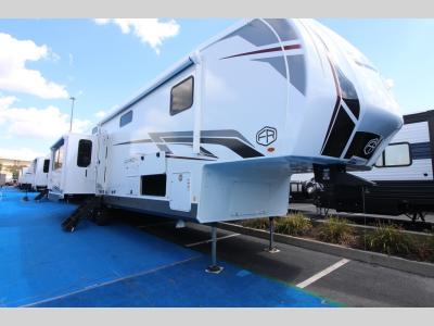Sleeps 9 Slides 4 Length 42 ft 7 in Ext Width 8 ft Ext Height 13 ft 2 in Hitch Weight 2335 lbs GVWR 14335 lbs Dry Weight 11538 lbs Cargo Capacity 2797 lbs Fresh Water Capacity 60 gals Grey Water Capacity 75 gals Black Water Capacity 38 gals Furnace BTU 35000 btu Number Of Bunks 2 Available Beds King Refrigerator Type 12V Refrigerator Size 16 cu ft Number of Awnings 2 LP Tank Capacity 20 lbs Water Heater Type On Demand Tankless AC BTU 45000 btu TV Info LR 50" TV Awning Info 19' & 11" Power Axle Count 2 Washer/Dryer Available Yes Number of LP Tanks 2 Shower Type Standard Electrical Service 50 amp Similar Fifth Wheel Floorplans