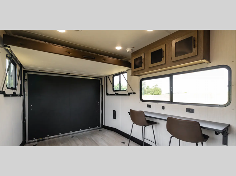 You will love the real wood cabinet doors and drawers inside, along with LED lights and a black stainless steel farm sink that will have you feeling more at home. There are power stabilizer jacks to make your RV more secure, and the power awning with LED accent lighting will create an outdoor space campground neighbors will want to check out.