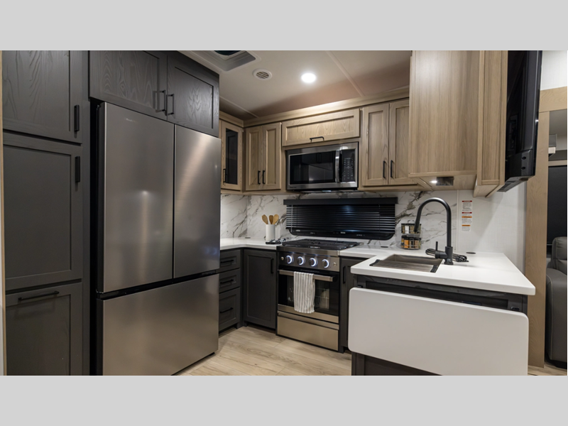 Sleeps 4 Slides 3 Length 36 ft 8 in Ext Width 8 ft Ext Height 13 ft 2 in Hitch Weight 1905 lbs Dry Weight 10844 lbs Cargo Capacity 1461 lbs Fresh Water Capacity 54 gals Grey Water Capacity 83 gals Black Water Capacity 53 gals Tire Size 16" Furnace BTU 35000 btu Available Beds King Refrigerator Type 12V Refrigerator Size 18 cu ft Cooktop Burners 3 Number of Awnings 2 LP Tank Capacity 30 lbs Water Heater Capacity 12 gal Water Heater Type Quick Recovery Gas/Electric AC BTU 15000 btu TV Info LR Smart TV Awning Info 13' & 10' Power with Adjustable Rain Dump & LED Light Strip Axle Count 2 Washer/Dryer Available Yes Number of LP Tanks 2 Shower Type Shower w/Seat Electrical Service 50 amp Similar Floorplans
