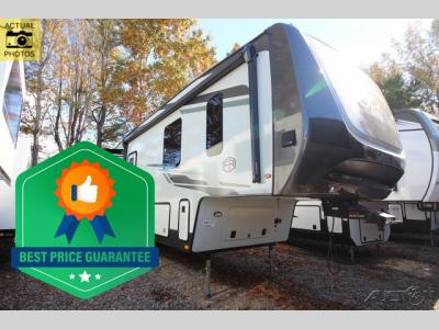 Sleeps 4 Slides 3 Length 36 ft 8 in Ext Width 8 ft Ext Height 13 ft 2 in Hitch Weight 1905 lbs Dry Weight 10844 lbs Cargo Capacity 1461 lbs Fresh Water Capacity 54 gals Grey Water Capacity 83 gals Black Water Capacity 53 gals Tire Size 16" Furnace BTU 35000 btu Available Beds King Refrigerator Type 12V Refrigerator Size 18 cu ft Cooktop Burners 3 Number of Awnings 2 LP Tank Capacity 30 lbs Water Heater Capacity 12 gal Water Heater Type Quick Recovery Gas/Electric AC BTU 15000 btu TV Info LR Smart TV Awning Info 13' & 10' Power with Adjustable Rain Dump & LED Light Strip Axle Count 2 Washer/Dryer Available Yes Number of LP Tanks 2 Shower Type Shower w/Seat Electrical Service 50 amp Similar Fifth Wheel Floorplans