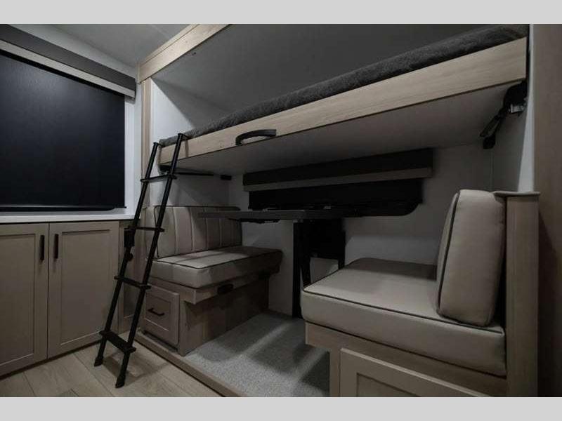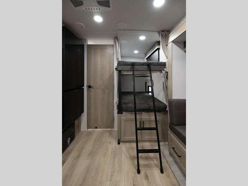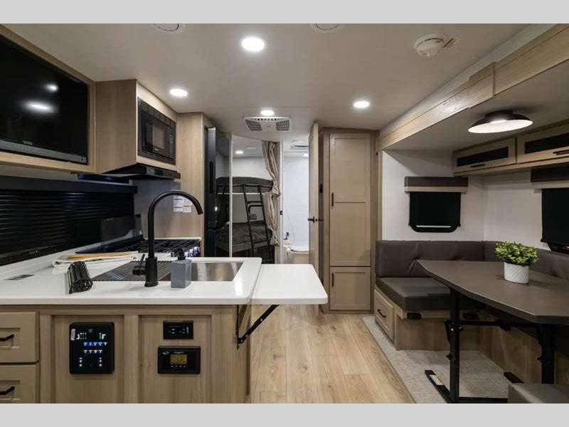 Sleeps 6 Slides 1 Length 25 ft 10 in Ext Width 8 ft Ext Height 10 ft 11 in Hitch Weight 580 lbs Dry Weight 5594 lbs Cargo Capacity 1986 lbs Fresh Water Capacity 54 gals Grey Water Capacity 29 gals Black Water Capacity 29 gals Furnace BTU 35000 btu Number Of Bunks 2 Available Beds RV Queen Refrigerator Type 12V Cooktop Burners 3 Number of Awnings 1 LP Tank Capacity 30 lbs Water Heater Capacity 6 gal Water Heater Type Gas/Electric with Quick Recovery AC BTU 15000 btu TV Info LR 12V Smart Entertainment TV Awning Info 18' Power with Adjustable Rain Dump and LED Lights Axle Count 2 Number of LP Tanks 2 Shower Type Radius Similar Floorplans