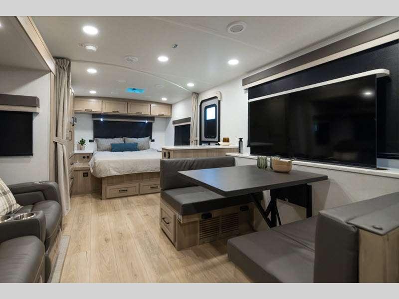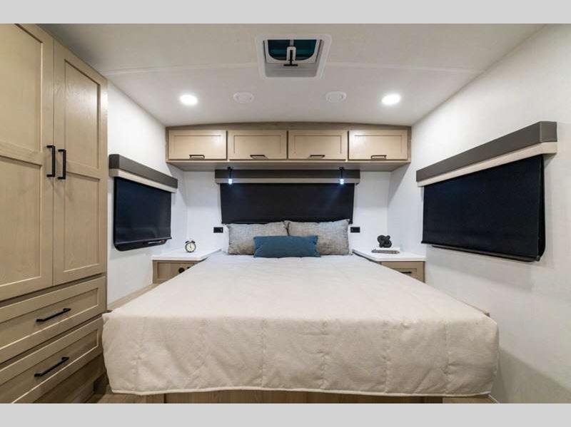 Each model is constructed with a fully laminated walkable roof, 6-sided full-aluminum frame, and a fiberglass front cap with Clear Coat for added protection. You will appreciate the slam baggage doors and 200W solar panel outside, plus there is a Climate Protection Package for better insulation. Inside, you'll love the solid surface countertops, roller shades, and soft close roller bearing drawers.