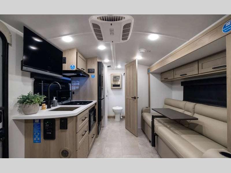 Sleeps 5 Slides 1 Length 21 ft 2 in Ext Width 7 ft 8 in Ext Height 10 ft 4 in Hitch Weight 501 lbs Dry Weight 3843 lbs Cargo Capacity 1155 lbs Fresh Water Capacity 31 gals Grey Water Capacity 27 gals Black Water Capacity 27 gals Furnace BTU 20000 btu Number Of Bunks 2 Available Beds Full Refrigerator Type 12V Convection Cooking Yes Cooktop Burners 3 Number of Awnings 1 LP Tank Capacity 20 lbs Water Heater Type Gas/Electric AC BTU 13500 btu TV Info 12V Smart TV Awning Info 14' Power Axle Count 1 Number of LP Tanks 2 Shower Type Standard Solar Wattage 200 watts Similar Floorplans
