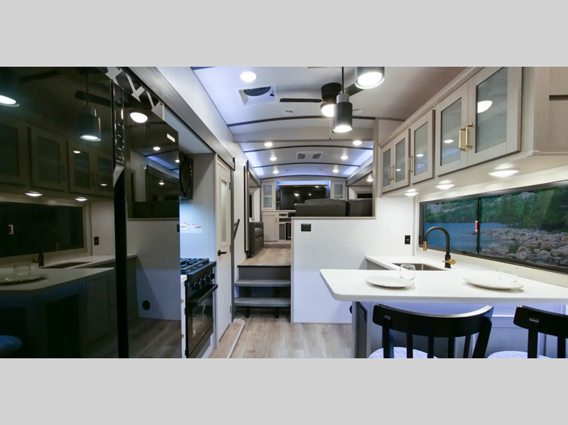 You will be quite impressed by the high-end solid-surface kitchen countertops, Windows with built in shades with reflective thermal-foil backing, and gold-accented faucets with stainless steel sinks in all bathrooms. The Accessibelly underbelly with 12V tank heaters will extend your camping season, and the RV Airflow System provides 25% better airflow to keep you comfortable.Â