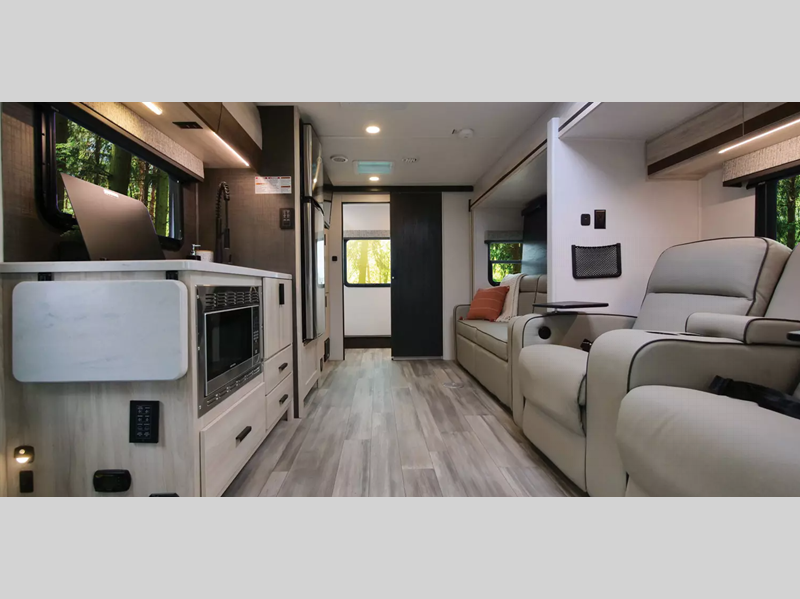 Sleeps 6 Slides 2 Length 25 ft 5 in Ext Width 7 ft 11 in Ext Height 11 ft 3 in Int Height 6 ft 9 in Exterior Color Full Body Paint Options; Platinum, Onyx Hitch Weight 4200 lbs GVWR 11030 lbs Fresh Water Capacity 35 gals Grey Water Capacity 32 gals Black Water Capacity 32 gals Furnace BTU 30000 btu Fuel Type Diesel Chassis Mercedes-Benz Fuel Capacity 26 gals Wheelbase 170 in Number Of Bunks 1 Available Beds RV Queen Refrigerator Type 12V Refrigerator Size 10.7 cu ft Convection Cooking Yes Cooktop Burners 2 Shower Size 24" x 36" Number of Awnings 1 Axle Weight Front 4080 lbs Axle Weight Rear 7720 lbs LP Tank Capacity 56 lbs Water Heater Capacity 6 gal Water Heater Type DSI Gas/Electric AC BTU 15000 btu TV Info Cab 12V TV, BR 12V TV Awning Info 15' 6" Power w/LED Light Strip Gross Combined Weight 15250 lbs Shower Type Standard Electrical Service 30 amp Similar Floorplans