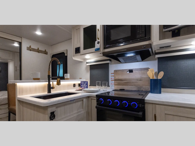 Sleeps 4 Slides 1 Length 24 ft 4 in Ext Width 7 ft 4 in Ext Height 10 ft 9 in Hitch Weight 425 lbs Dry Weight 4128 lbs Cargo Capacity 1497 lbs Fresh Water Capacity 30 gals Grey Water Capacity 30 gals Black Water Capacity 30 gals Available Beds Queen Refrigerator Type 12V Black Glass Refrigerator Size 10 cu ft Convection Cooking Yes Cooktop Burners 2 Number of Awnings 1 Water Heater Type Tankless AC BTU 15000 btu TV Info LR HD TV Awning Info 16' Electric w/LED Light Strip Axle Count 1 Shower Type Standard Electrical Service 30 amp Similar Floorplans