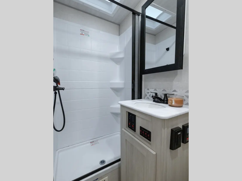 Sleeps 5 Slides 1 Length 27 ft Ext Width 8 ft Ext Height 11 ft 3 in Hitch Weight 550 lbs Dry Weight 5493 lbs Cargo Capacity 2057 lbs Fresh Water Capacity 40 gals Grey Water Capacity 30 gals Black Water Capacity 30 gals Available Beds Queen Refrigerator Type 12V Black Glass Refrigerator Size 10 cu ft Cooktop Burners 3 Number of Awnings 1 Water Heater Type Tankless AC BTU 15000 btu TV Info LR HD TV Awning Info 18' Electric w/LED Light Strip Axle Count 2 Shower Type Standard Electrical Service 30 amp Similar Floorplans