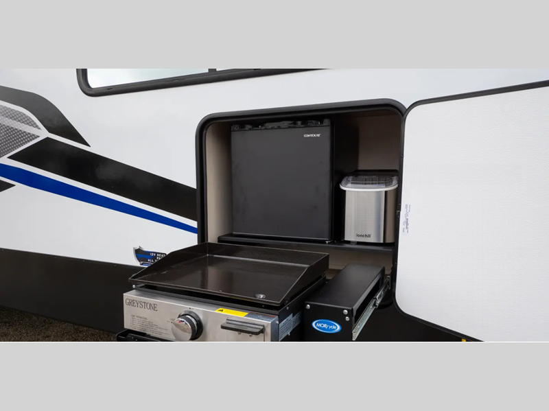 There is a 3,000 lb. rated ramp door on each model, along with DuraPoxy gas/oil resistant flooring, and 5,000 lbs. tie-downs to keep your toys secure on the way to the campground. You can enjoy your toy hauler for years to come thanks to the aluminum frame sidewalls and radius PVC walk-on roof, and the 102" wide body construction will make it easier than ever to load up dirt bikes, four-wheelers, or kayaks! Inside, you'll love the zebra shades in the living areas, the glass shower doors, the quick set garage bed system, and many more comforts!