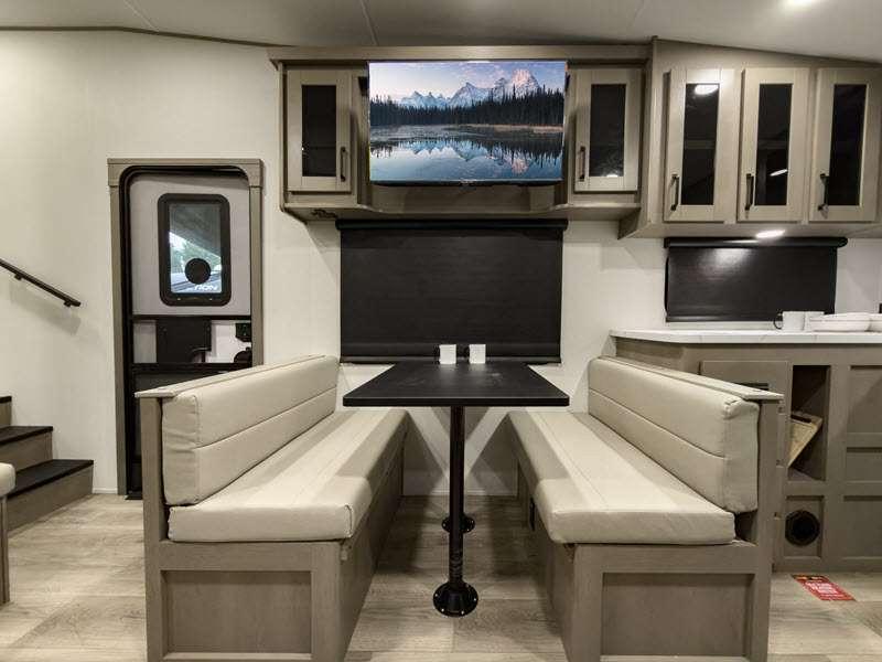 Each fifth wheel has 90-degre turning radius capabilities which allows you to be comfortable driving in town and parking into your campsite. Some construction and Arctic 4-Seasons Protection package features include a one-piece TPO roof membrane, a heated and enclosed underbelly with circulating heat, 12V heat pads on the holding tanks, and a heated pass-through storage area so you can travel and enjoy any climate. The interior offers large panoramic slide room windows for great views, premium Congoleum flooring for durability, and an On Demand water heater.
