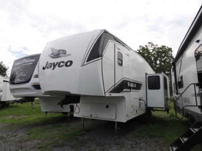 With any Eagle SLE fifth wheel by Jayco, you will enjoy a lighter tow weight, high-end finishes, and the same quality construction you've come to expect from Jayco! There is an Alpha Ply TPO roof membrane, a fully enclosed and heated underbelly, plus Stronghold VBL walls for added durability. There is also a rear 2" towing receiver outside, along with metal slam latch baggage doors, MORryde Step Above entry steps, and a Winegard Air 360 antenna with router prep if you want to stay connected as you camp. Once inside you'll enjoy the handcrafted door/drawer fronts, shower skylight, and residential vinyl flooring throughout with no carpet for an easier clean. The on-demand water heater, 30K BTU furnace, and 15K BTU "Whisper Quiet" A/C will ensure your comfort, and the Overland 1 Solar Package will provide off-grid capabilities!