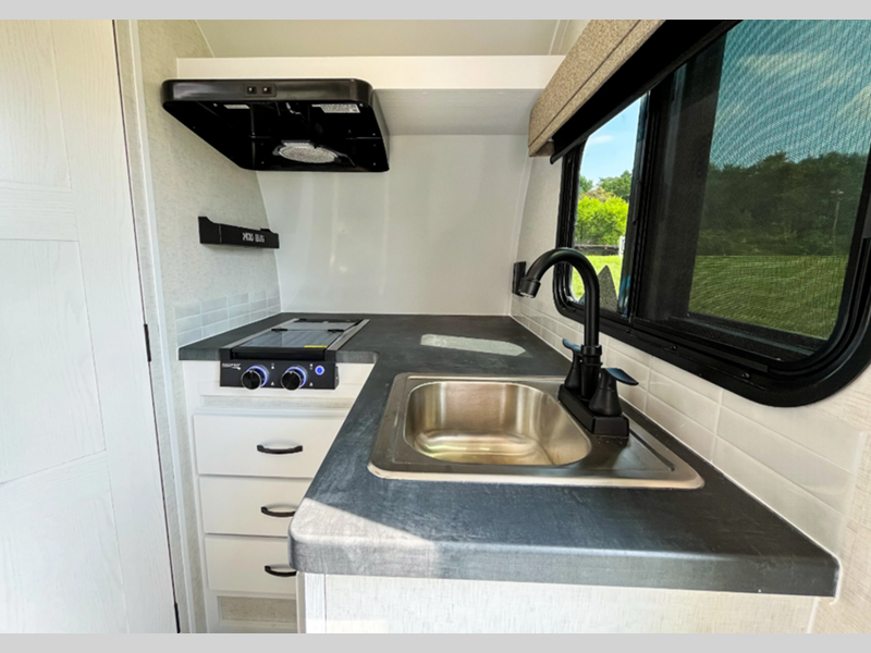 Sleeps 3 Length 14 ft 8 in Ext Width 6 ft 11 in Ext Height 9 ft 4 in Int Height 6 ft 2 in Dry Weight 2198 lbs Fresh Water Capacity 16 gals Grey Water Capacity 18 gals Tire Size ST235-75R15 Refrigerator Type Large Cooktop Burners 2 Axle Weight 3500 lbs Water Heater Type Fogatti On Demand Axle Count 1 Shower Type N/A -