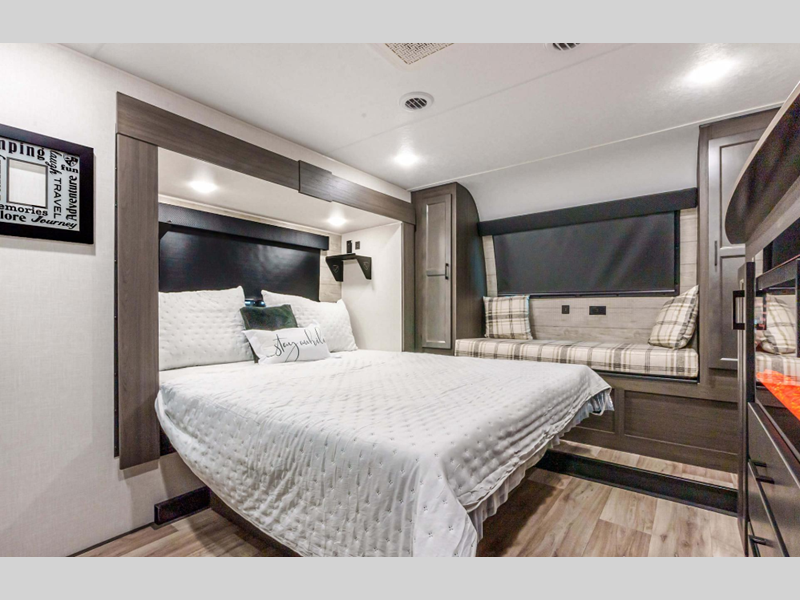 A PVC roof membrane covers protects the top of these units and a heated and enclosed underbelly protects the bottom. The RV airflow A/C system increases the 15,000 BTU air flow by an average of 40% for an improved performance, faster cooling time, and reduction of noise. You will also appreciate the 200W solar panel for off-grid capabilities, and the leveling system will have you set up at camp in no-time!