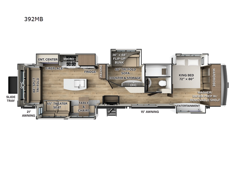 Get ready to live in comfort and style when you take this fifth wheel with you! You will love the unique railing entry with no interior stairs and spacious main living area and kitchen thanks to the dual opposing slides. You can relax on the theater seats with cupholders, the split tri-fold sofa that also offers sleeping space, or at the free-standing table and residential dinette chairs. The kitchen is loaded with amenities including the residential appliances, the pantry, and the island. And you will love the multi-functional middle bunkhouse that offers a flip-up bunk and 68" tri-fold sofa below, plus a counter and storage that you can utilize as an office or the kids can do homework from here. The front bedroom includes a king bed slide a wardrobe and a space prepped for a washer and dryer option. The Signature Spa walk-in shower with a teak wood seat inside the full bathroom is just another reason you will love this RV.Â