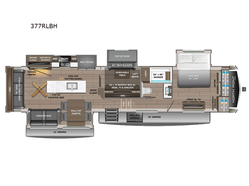 | TV Info | LR 4K Smart LED HDTV, BR 32" 4K Smart TV | Awning Info | 11' and 20' Electric with Integrated LED Lights |
